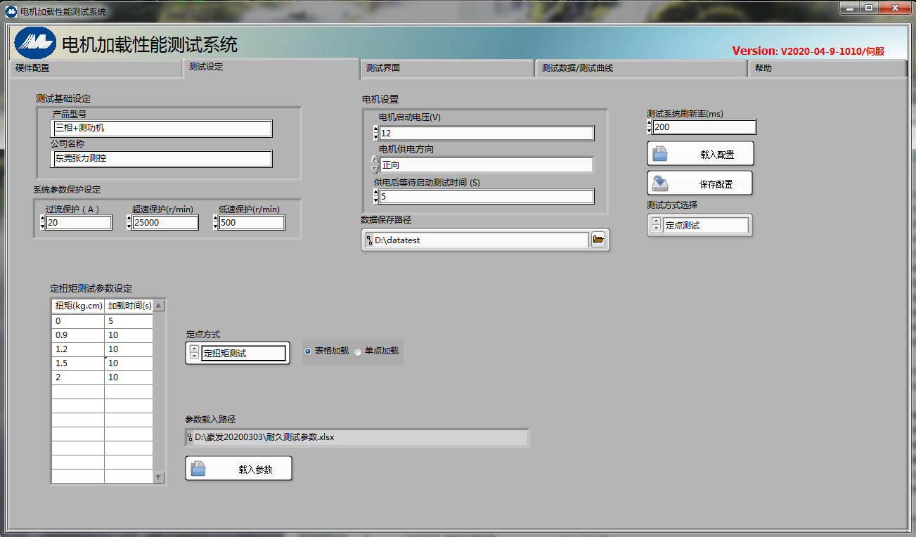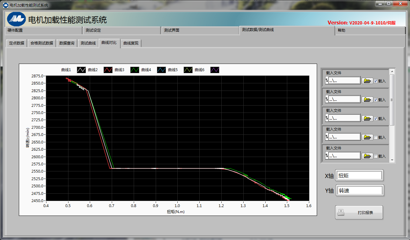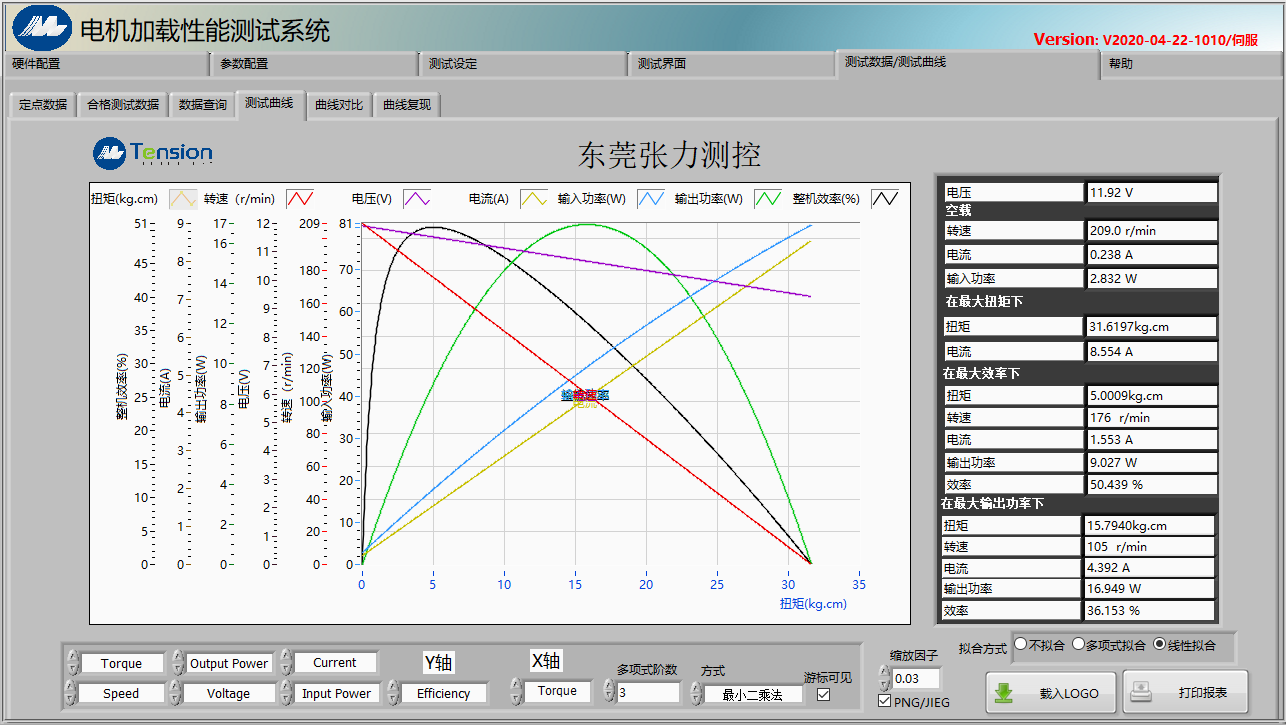 •自動測試方式:即負(fù)載根據(jù)設(shè)置自動加載,掃描出電機(jī)從空載到堵轉(zhuǎn)(或設(shè)定值)的特征曲線。因?yàn)殡姍C(jī)在零載到相應(yīng)負(fù)載和相應(yīng)負(fù)載到空載這個過程中,下降曲線和回升曲線是存在相應(yīng)誤差,系統(tǒng)可以通過下降曲線和回升曲線計(jì)算擬合出電機(jī)最真實(shí)的曲線,所以此界面就是最好的測試方式。