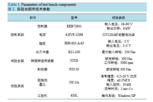輪轂電機性能試驗臺主要由三部分組成:輪轂電機控制系統、試驗臺架和測量與測控系統。各部件 技術參數見表 1。