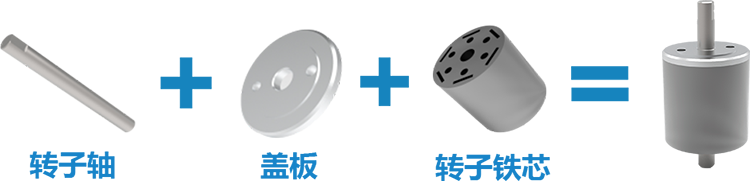 馬達轉子軸與鐵芯及蓋板過盈配合壓裝。