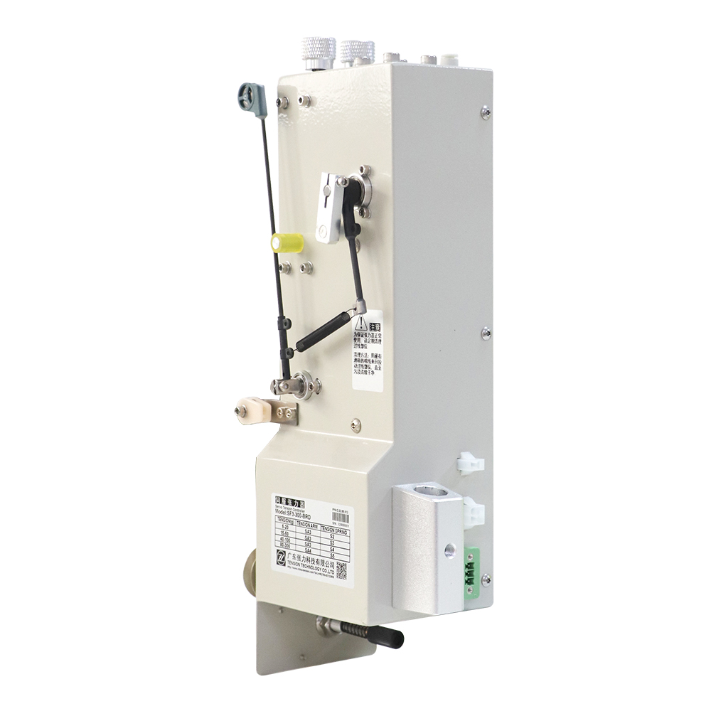 SF3-BRD系列帶氣缸且張力輪在正面的伺服張力器。該系列產品最高繞線速度可達20m/s,其氣缸裝在機殼內部,具有衰減功能,未接通氣壓時,可通過張力調節旋鈕和擺動臂上下旋鈕來控制張力;在繞線、掛線等過程中的某段需要較大的張力時,可接通氣壓,此時繞線機通過電磁閥對氣閥進行切換控制,使擺動臂擋塊擺動一定的角度,實現兩段張力值的切換,避免發生斷線。該系列具體型號及配置見右側表格,用戶可根據自用線徑及張力范圍選擇合適的型號。