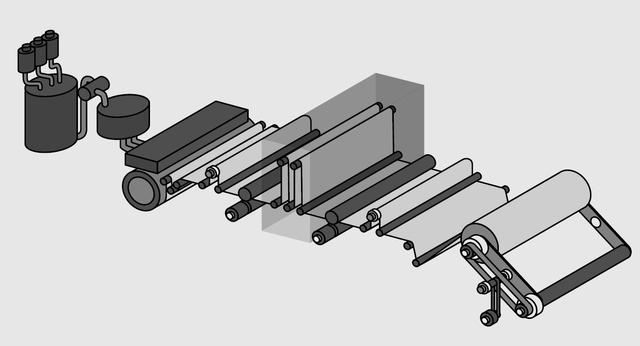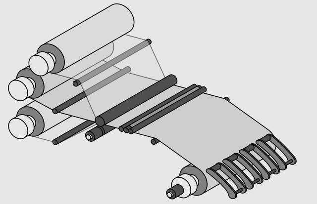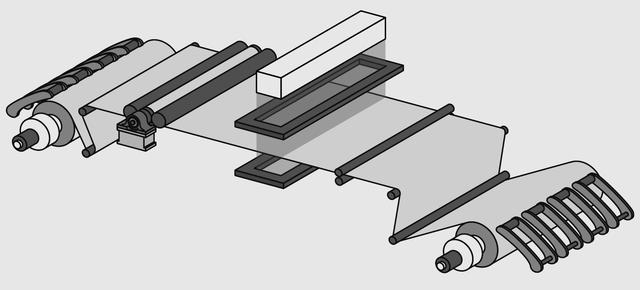 主軸電機驅動主軸,并從左向右進給長形材料。電機的速度決定進給速度(線速度),但與張力沒關系。不過,張力變大后需要輸出功率大的電機。